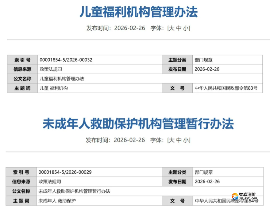 近日,民政部公布新修訂的《兒童福利機構(gòu)管理辦法》和《未成年人救助保護機構(gòu)管理暫行辦法》。兩個辦法均自2026年4月1日起施行,并在內(nèi)部管理章節(jié)明確機構(gòu)安全管理主體責任,提出完善消防安全、應急管理等方面的具體措施和監(jiān)管要求。